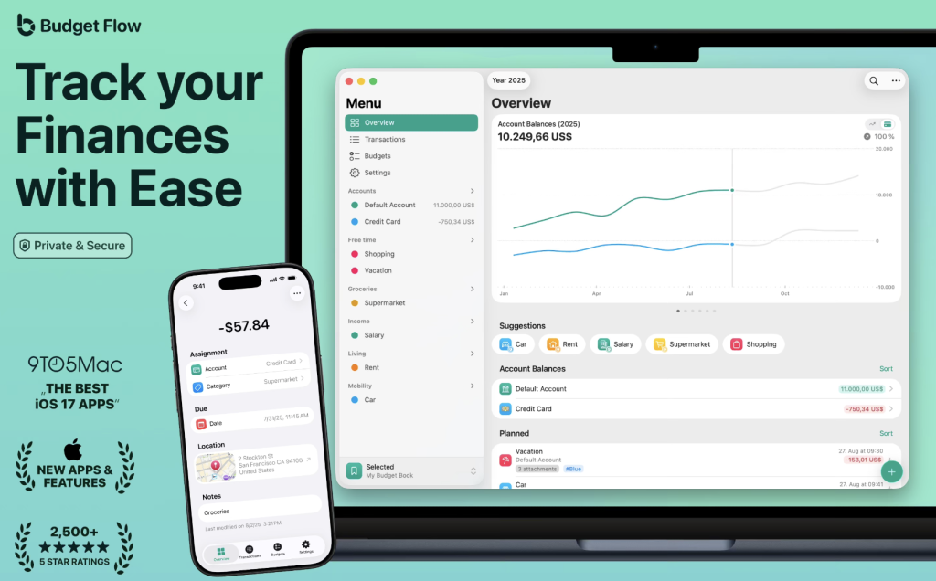 Why choose it: Budget Flow is a clean, intuitive app for Mac, iPhone, iPad, and Apple Watch. It focuses on daily expense tracking, account management, and habit-building. iCloud sync keeps all data updated across devices.