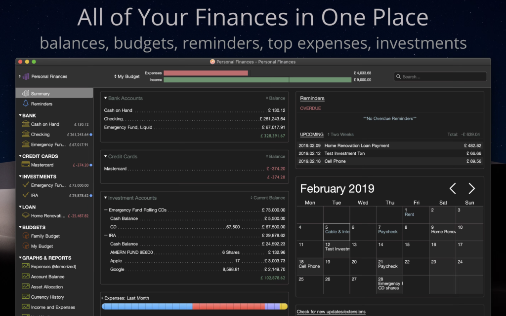 Why choose it: Moneydance is a long-standing desktop finance app with a one-time purchase model. It manages accounts, budgets, investments, and generates detailed reports, all offline for full privacy.
