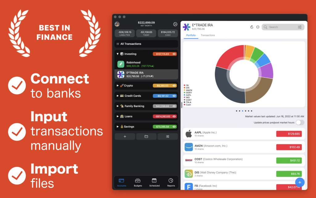 Best for: Mac-focused users managing multiple accounts or investments who want a robust Apple-integrated finance system.